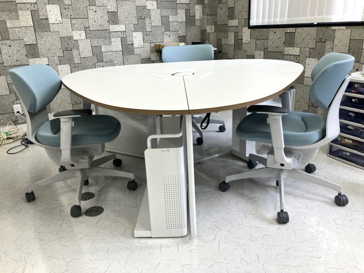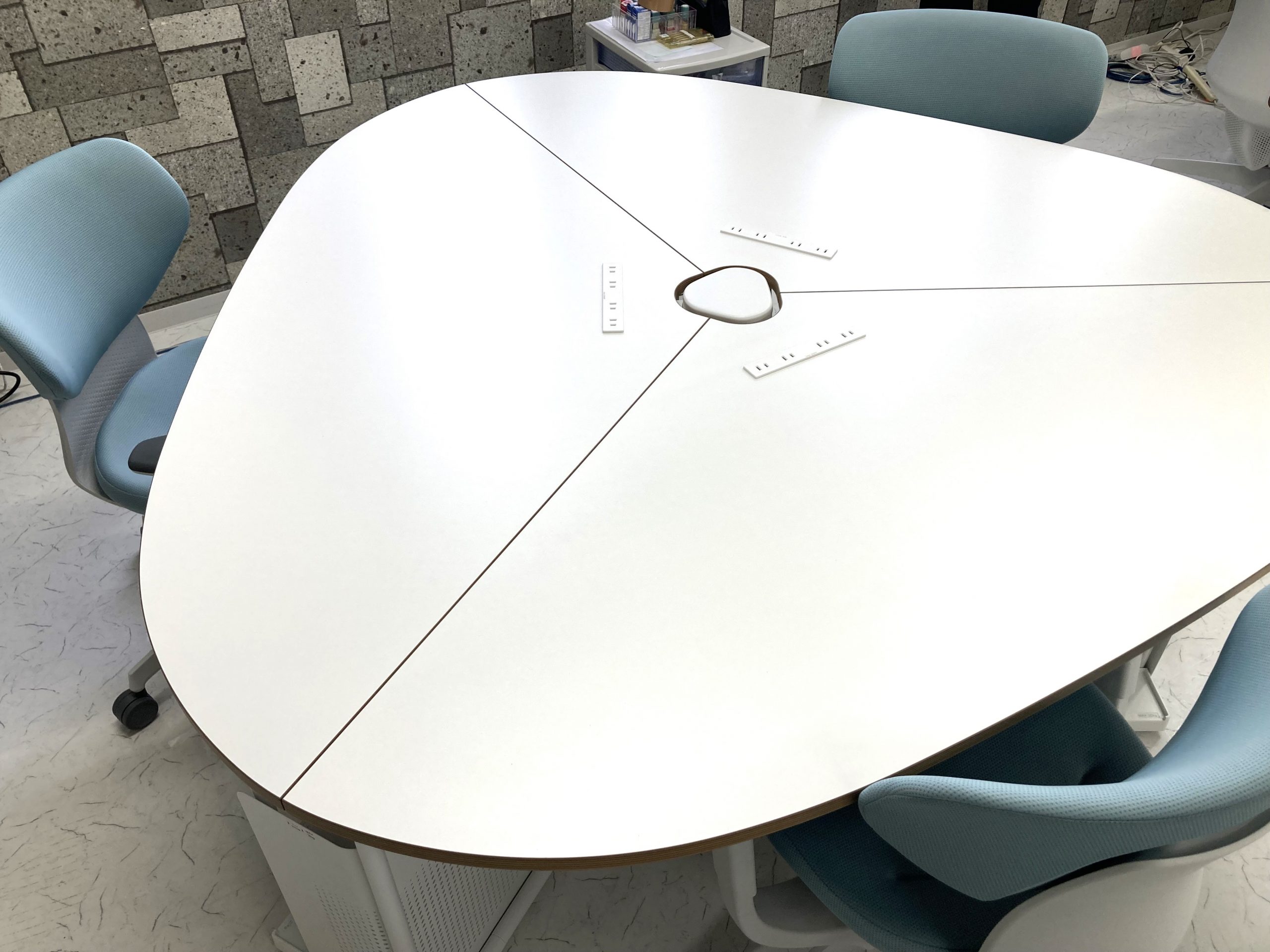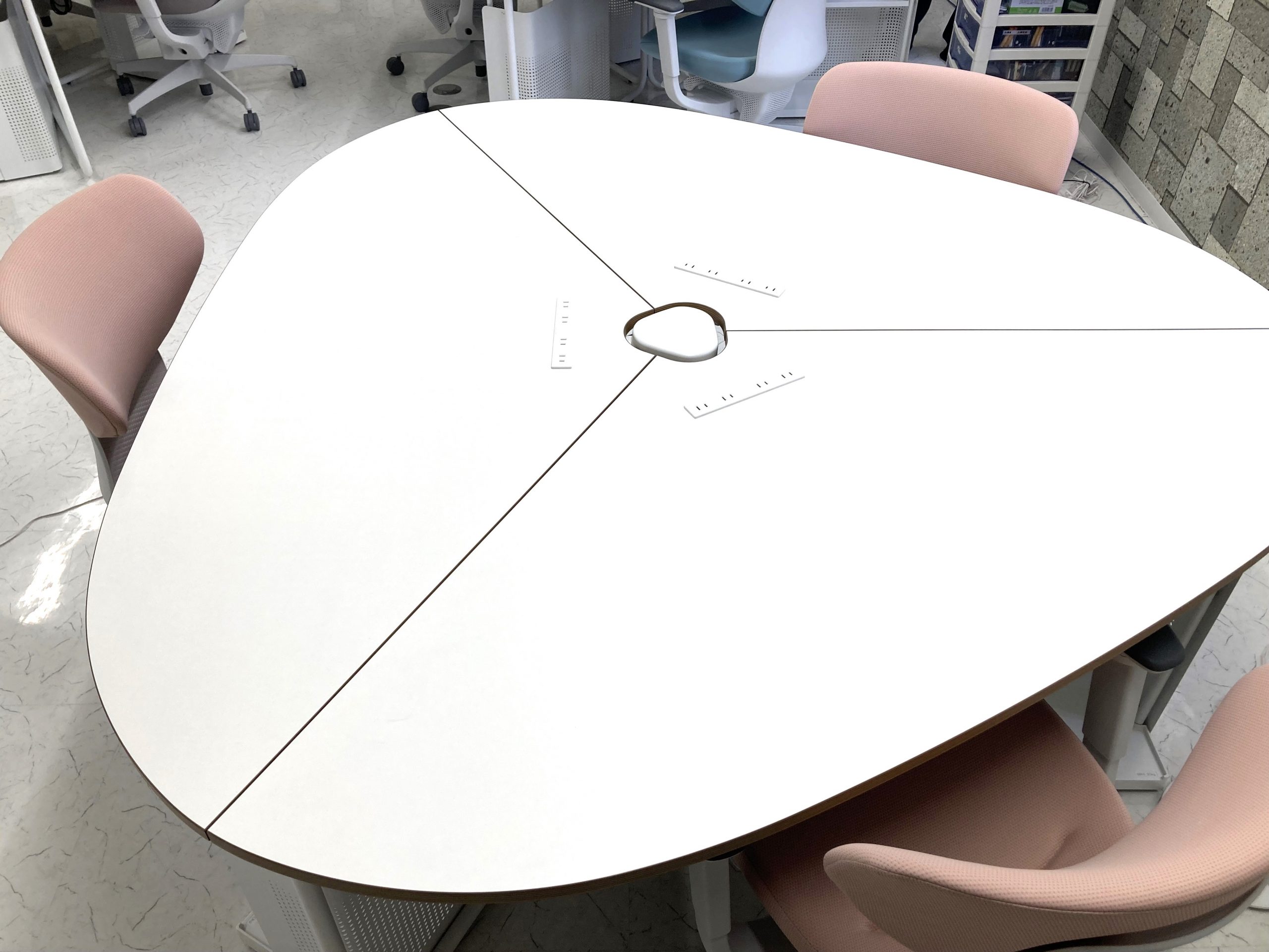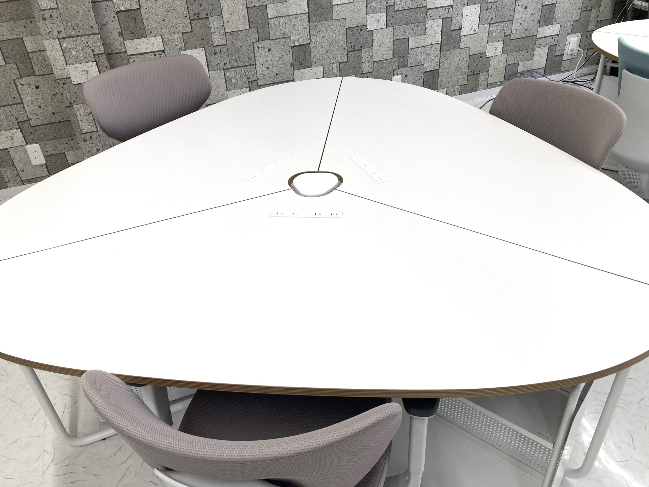 特徴的な三角形のテーブルは、席についたメンバー同士の会話がしやすく、訪問者も話しかけやすい、コミュニケーションを促すデザインです。