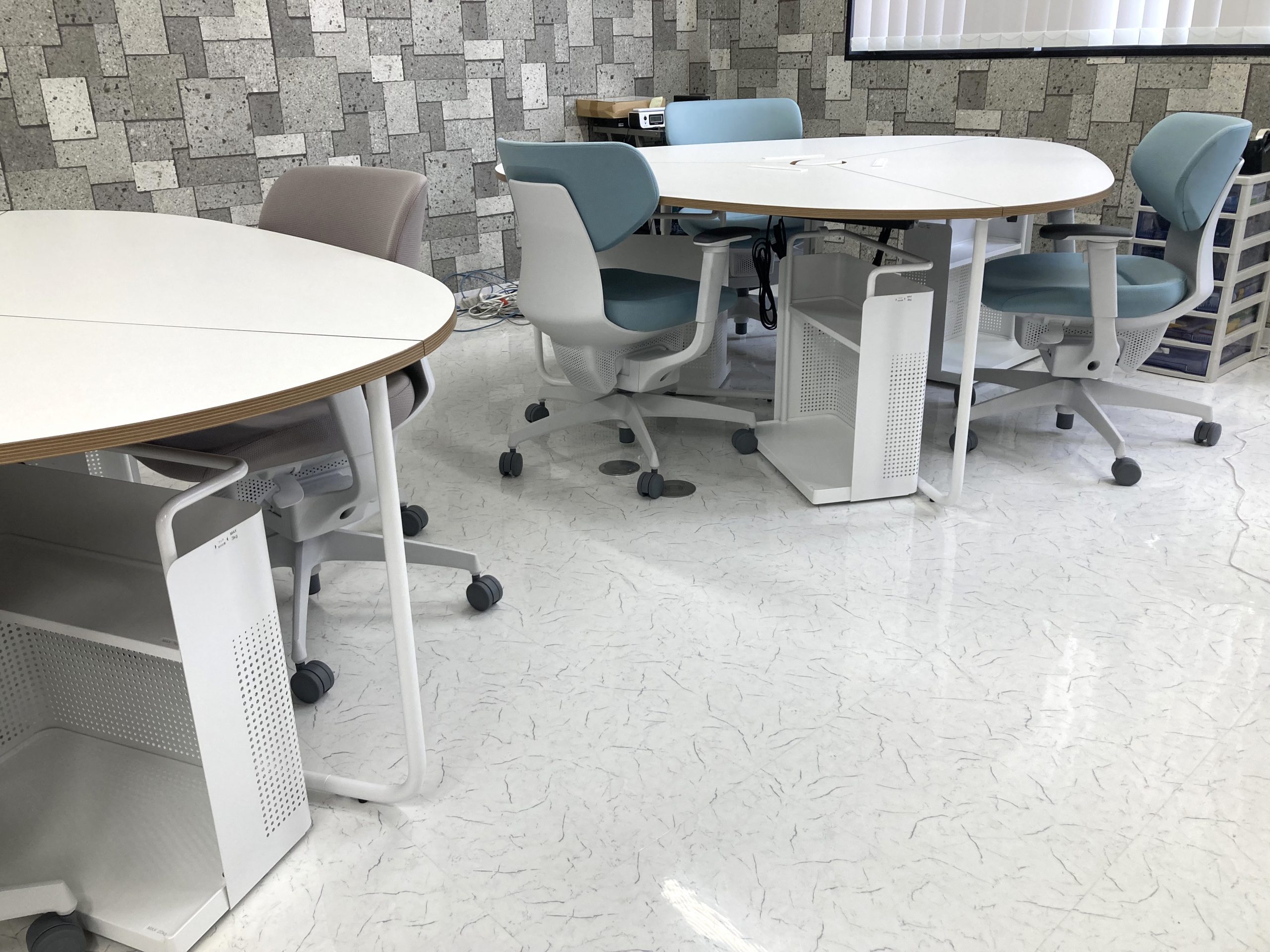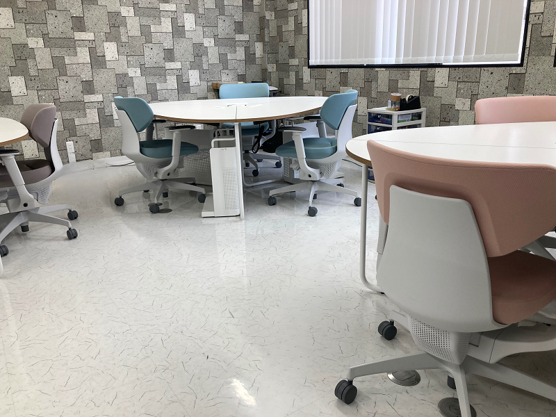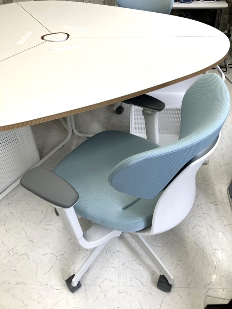 テーブルごとに色の変化をつけたチェアーは、体のどんな動きにも追随する360°グライディングと、固定の切り替えが可能。